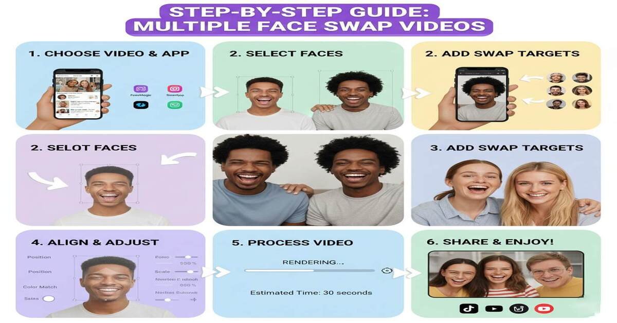 - The step-by-step process of multiple face swap video is not about learning how to use complex software. It is concerning intelligent means to unleash creative variation. Face Swap turns inanimate images into dynamic content and makes the production of videos more dynamic and creative.